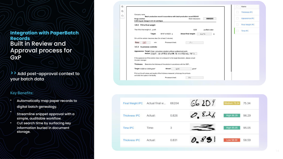 For instance, we use pharma-specific OCR engine with machine learning algorithms to extract and contextualize critical information from handwritten and printed records. This eliminates the need for manual data entry, and reduces efforts for paper batch record digitization by up to 90%. Once the data is digitized, the AI engine uses the knowledge graph architecture to automatically create the genealogy by mapping materials, equipment, process steps, and outcomes without manual intervention. Years of batch history can be processed and structured in just hours, enabling QA and manufacturing teams to access complete traceability faster than ever before.