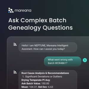 By integrating data from LIMS, QMS, CDMOs, and other sources, Mareana’s AI-powered genealogy shortens investigation times and simplifies root cause analysis. What once took days can now be done in minutes, that too with full traceability and confidence.